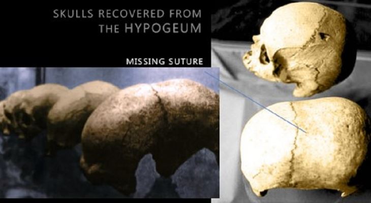 In the oldest underground temple and necropolis in the world – the Hal Saflieni Hypogeum, here in Malta – was discovered a collection of skulls that show peculiar abnormalities and/or pathologies: sometimes inexistent cranial knitting lines abnormally developed temporal partitions; evidence of drilling and swelling at the back of the head, possibly from recovered traumas; and, strangest of all, a lengthened skull lacking a fossa median, the join that runs along the top of the skull.