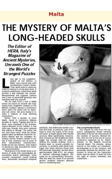 Photos and books by Dr Anton Mifsud and his colleague Dr Charles Savona Ventura, who first investigated the skulls, testify to their existence and abnormality. Vittorio Di Cesare and Adriano Forgione of HERA magazine, Rome, Italy were the only non-officials able to obtain permission to investigate the skulls.