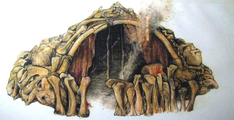 Artist rendition of dwelling in Mezhirich, Ukraine, made of mammoth bones. Source: Dolní Věstonice Museum
