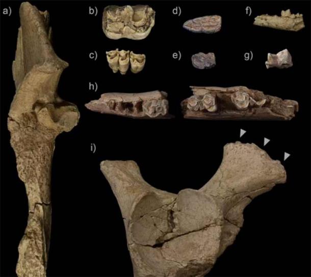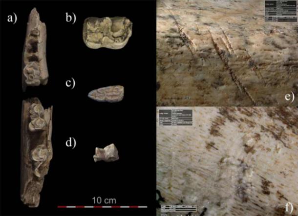 Faunal remains from the Navalmaíllo site include a) jaw of a large bovid; b) rhinoceros molar; c) horse molar; d) molar hyena; e) stone tool cutting marks, and f) percussion mark to access the medulla of a long bone