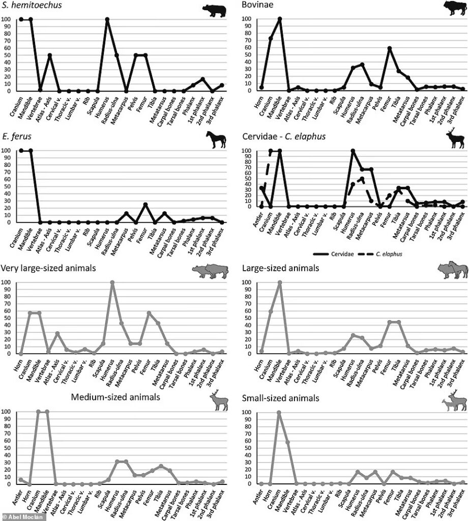 These graphs show the types of very large, large, medium and small-sized animals found at the site. Human use of animal resources at the site reflects a focus on primary access to large bovids and cervids. Access to horses, rhinoceroses and small-sized animals was much less frequent, the researchers said