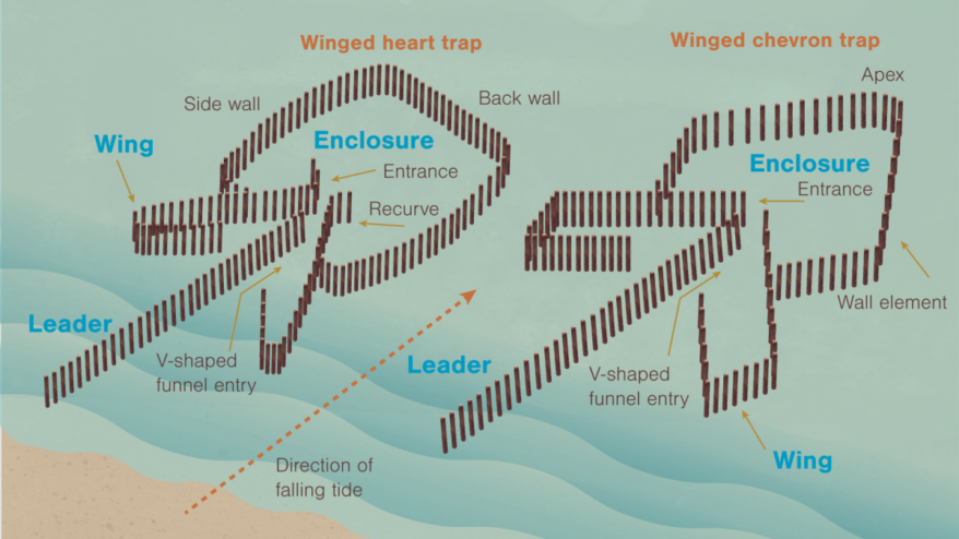The fish traps used wooden stakes and woven panels to make fences along the shore. When the tide came in, the fish would swim up and into the fish trap, but they wouldn’t be able to find their way out.