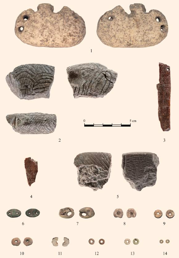 Artefacts from NEG II: 1 – perforated piece; 2-5 – decorated objects; 6 – greenstone spacers; 7 – shell bead; 8-10 – disc beads; 10, 12-14 – disc beads pre-forms.