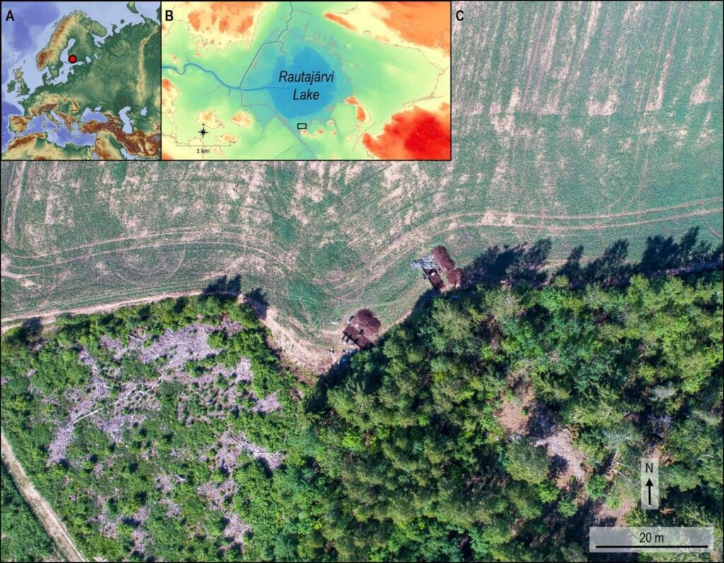 Järvensuo 1, a wetland site, is located in south-west Finland at the foot of a moraine hill rising in the middle of a large peatland plateau. Archaeological interest is with the southern shore of the drained Rautajärvi Lake. a) Location map; b) study area at Järvensuo; c) aerial photograph of the site