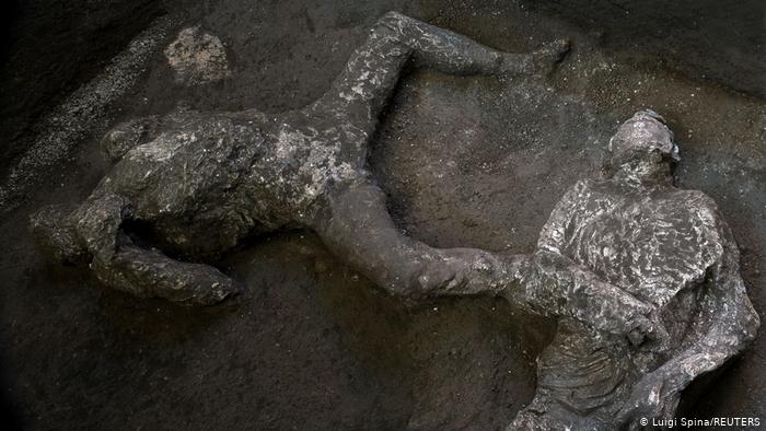 In a statement issued by Pompeii officials, they said that the men apparently escaped the initial fall of ash from Mount Vesuvius but then succumbed to a powerful volcanic blast that took place the next morning. The later blast “apparently invaded the area from many points, surrounding and burying the victims in ash,” the officials said.