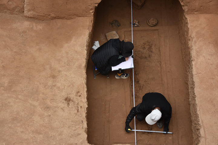 Archaeologists carry out the excavation work at the Dabaozi Cemetery in Xixian New Area, Shaanxi Province, China.