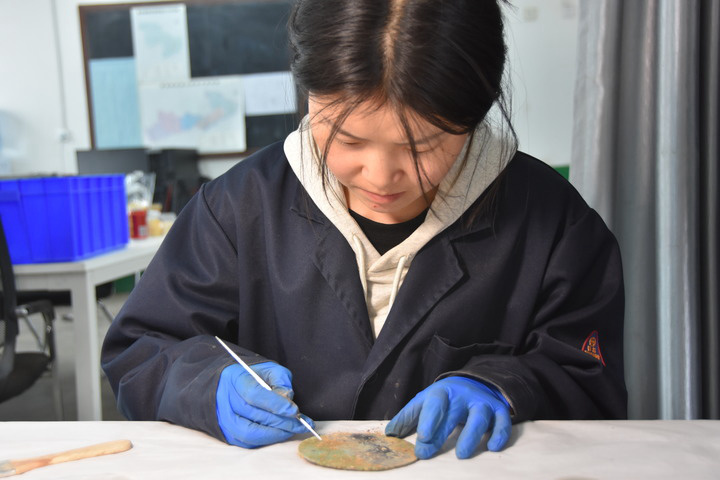 An archaeologist is cleaning a bronze mirror in Xixian New Area, Shaanxi Province, China.