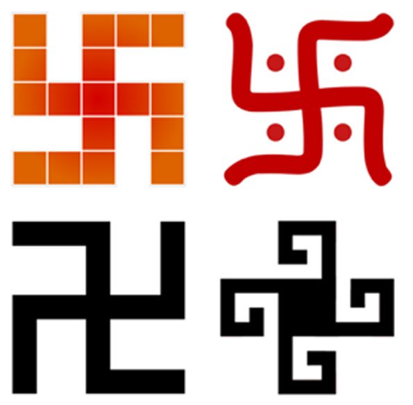 A swastika is a symbol found in many cultures, with different meanings, drawn in different styles.