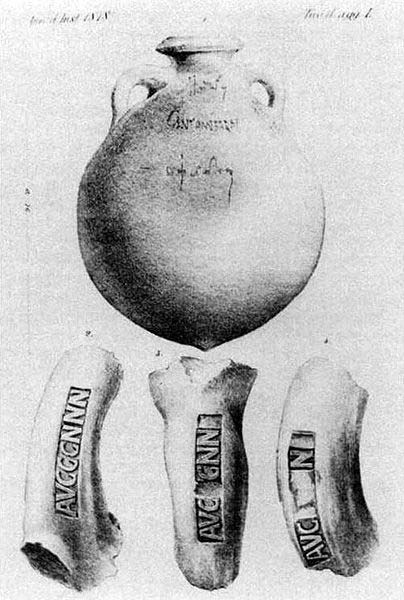Roman tituli picti from amphorae found at Monte Testaccio, Rome. From H. Dressel, Ricerche sul Monte Testaccio, Annali dell’Instituto di Correspondenza Archeologica [1878], plate L.
