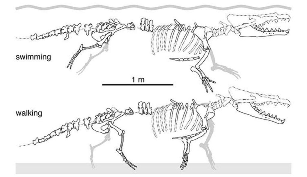 Schematic drawings depict the skeleton of Peregocetus in walking and swimming stance. Solid lines indicate the main preserved bones, while dotted lines indicate reconstructed parts.