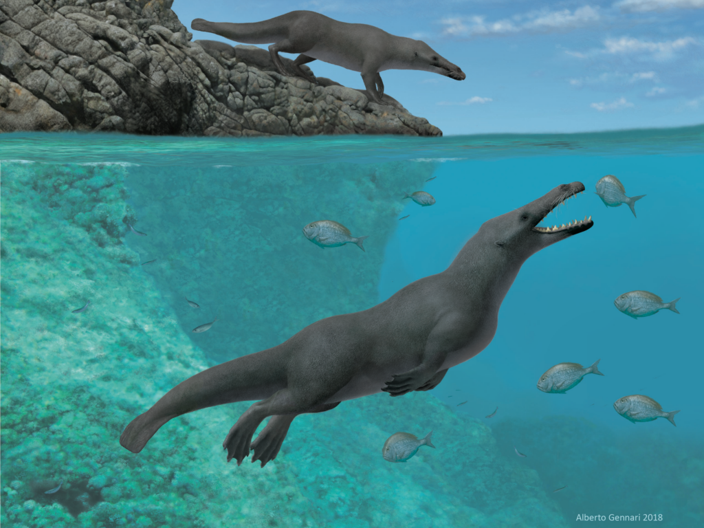 An artistic reconstruction of two individuals of Peregocetus, one standing on the rocky shore of modern-day Peru and the other preying on fish. The existence of a tail fluke remains hypothetical.