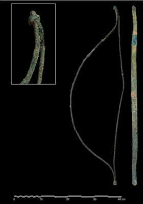 The bows are made up of a flat, curved stave bent at both ends which are connected by a string made of bronze. The size of the bows – 28 inches (70cm) on average – and above all the material used, shows that they were imitations of the real things made of perishable materials such as wood and tendons.