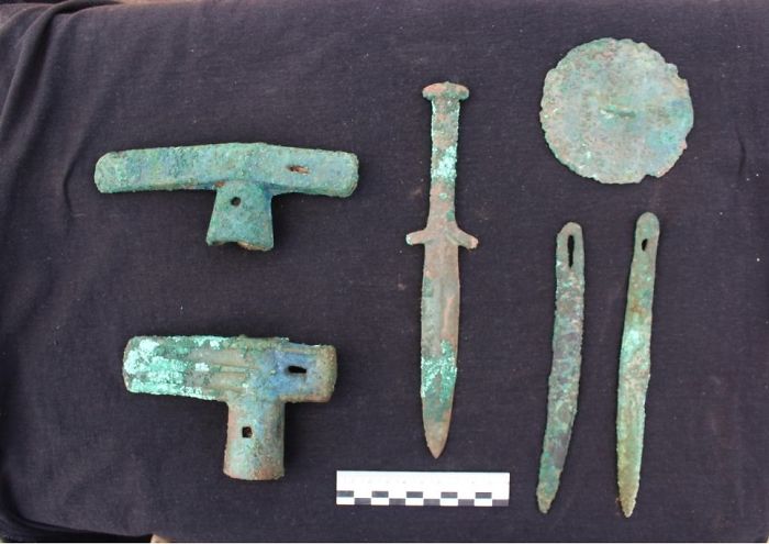 Wooden handles of the weapons have no survived millennia in soil, but the metallic elements have. The couple, the baby and servant, are from the Tagar culture, part of the Scythian civilisation, researchers believe.