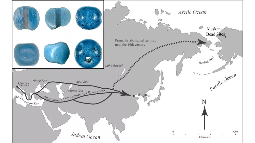 Researchers from the University of Alaska suggest the beads were among trinkets that passed hands through various trade routes — starting in Europe, then along the Silk Road to China, through Siberia and finally to the Bering Strait. According to the study, the new discovery resets the clock on when traded began between Europe and North America.