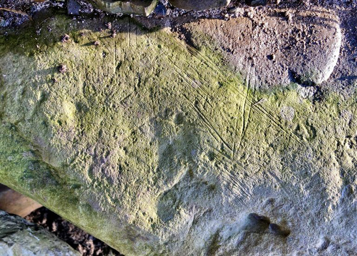 Closer inspection found the stone marked with a pair of incised triangles and a series of rectangular bands running across the surface.