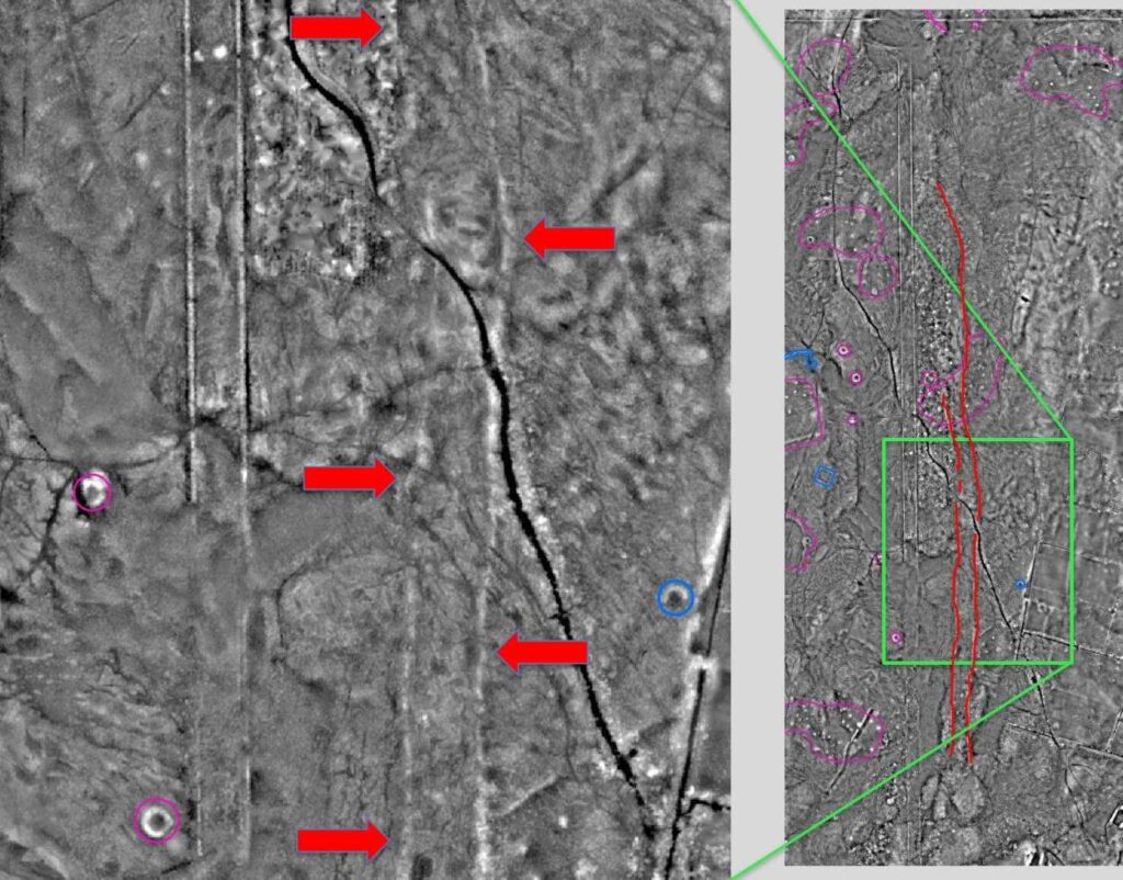 Mr. Cowley detected the site after picking up two lines of mounds, which lie roughly parallel and stand 30 to 40 centimeters high, and which run for around a kilometer.