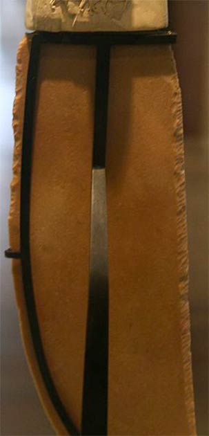 Everything in this weapon illustrates luxury and technical expertise. The blade, made of extremely high-quality, light ocher slate, reflects an accomplished mastery of stone-cutting techniques. Parallel strips were removed on one side to form a regular pattern.