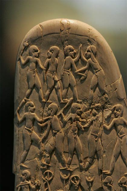 The other side depicts combats arranged in several registers. At the top are quasi-nude men wearing penis sheaths, in hand-to-hand combat. At the bottom, dead bodies are strewn between two different types of boats, both in use in Egypt during the Naqada period.