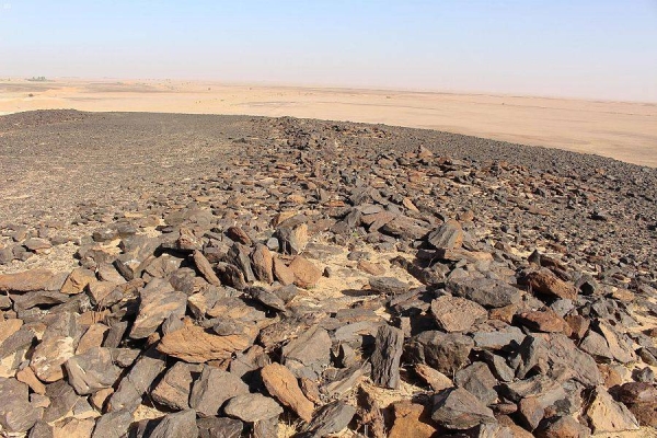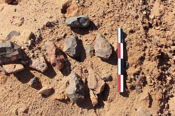 While exploring the site near Shuaib Al-Adgham in the Al-Qassim area, the Heritage Authority found a range of Neolithic tools: iron knives, scrapers, axes, and stone pierce tools from the Middle Paleolithic period.