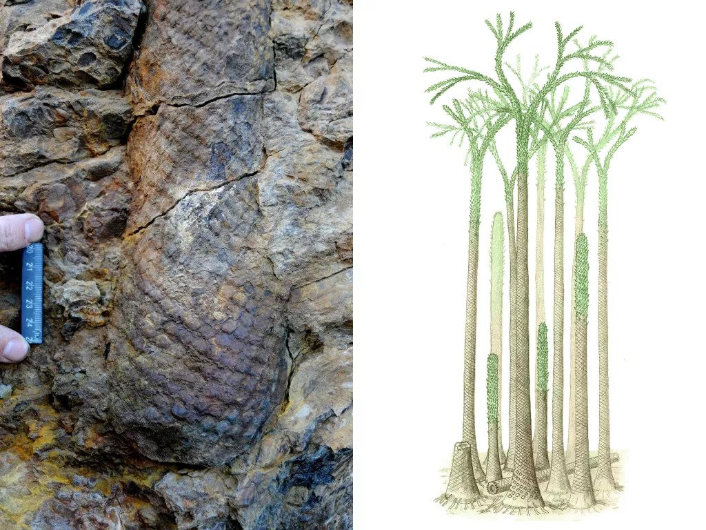 Partial tree trunk with the base preserved, at the site in Svalbard (left) and a reconstruction of what the ancient forest look liked 380 million years ago (right)