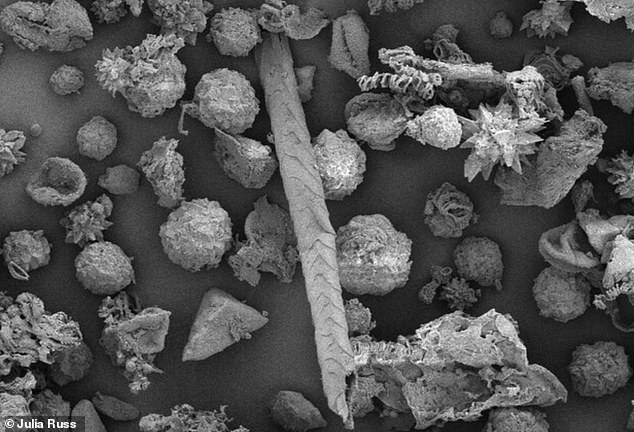 Microscopy of minuscule plant remnants, pollen and animal remains, including a mammal hair (centre), extracted from the intestinal tract of a mummy found in Arizona’s Ventana Cave