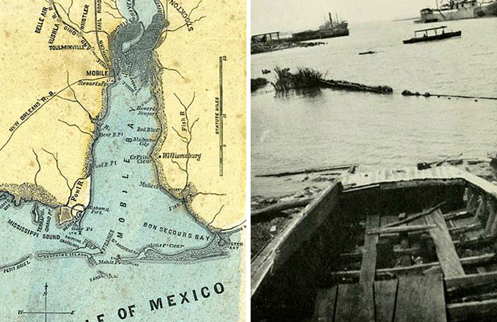 Mobile Bay and the wreckage of slave ship Clotilda are pictured above.