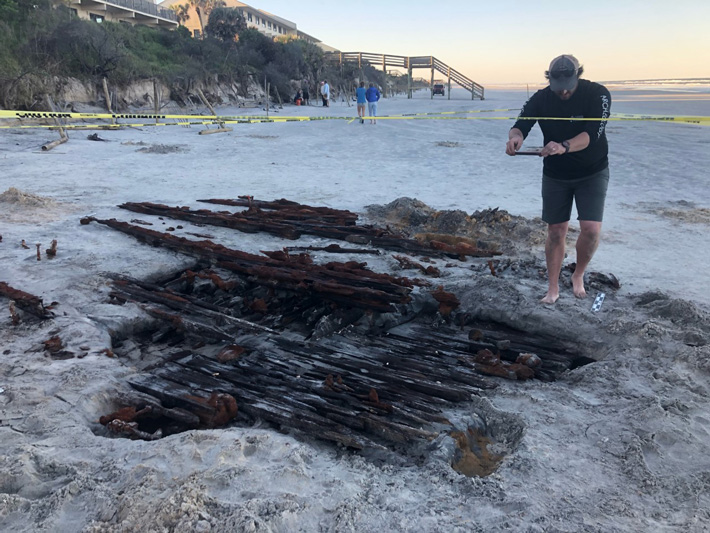 Archaeologist Chuck Meide stood near the middle of the exposed wooden beams in the sand and said, “If I were standing on this ship when it was a living ship, I would be in the cargo hold, standing on the very bottom. So this would be the floor of the cargo hold.