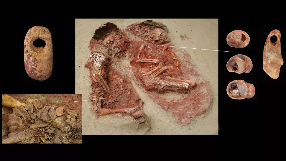 Along with the beads, a pierced fox incisor and three perforated molluscs, which were likely pendants on a necklace, were also found according to the study. Protecting the infant bodies from the elements above, a mammoth shoulder blade had been placed over their bodies.