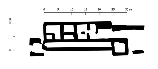 The remains appear to be of a fairly typical form with a number of stone and tile buildings surrounding a central courtyard, the survey also suggested its association with a field system, a trackway and other related buildings and structures.
