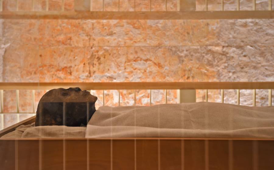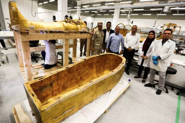 The gilded sarcophagus of the ancient Egyptian Pharaoh now lies in the restoration laboratory of the Grand Egyptian Museum in Giza, which lies on the outskirts of Cairo, Egypt.
