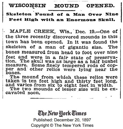 The article goes on to describe two stones with “curious inscriptions” and underneath were the bones of a body that “could not have been less than 12 feet in length.” According to the NY Times article, “the men who opened the grave say that the forearm was 4 feet long and that in a well-preserved jaw the lower teeth ranged from the size of a hickory nut to that of the largest walnut in size .”