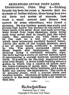 Here’s another New York Times article about skeletons that were discovered in 1885. Going back further still, in 1774 settlers found what they called “The Giant Town,” which housed several gigantic skeletons, one being an eight-foot-tall male.