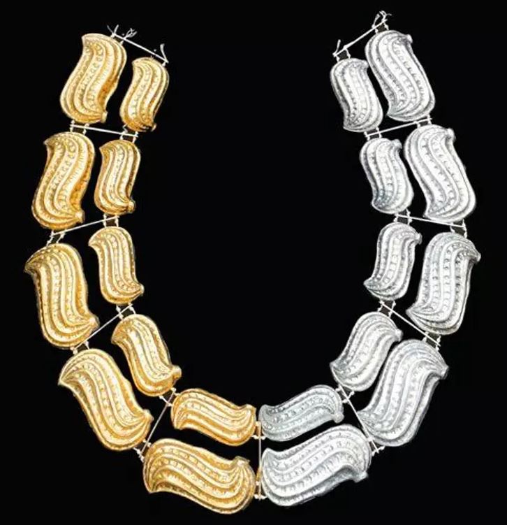 The necklaces were made with beads of gold and silver in the shape of maní (peanuts), an important food staple for the Moche. There were ten kernels on the right side made of gold, signifying masculinity and the sun god, and ten kernels on the left side made of silver, to represent femininity and the moon god.