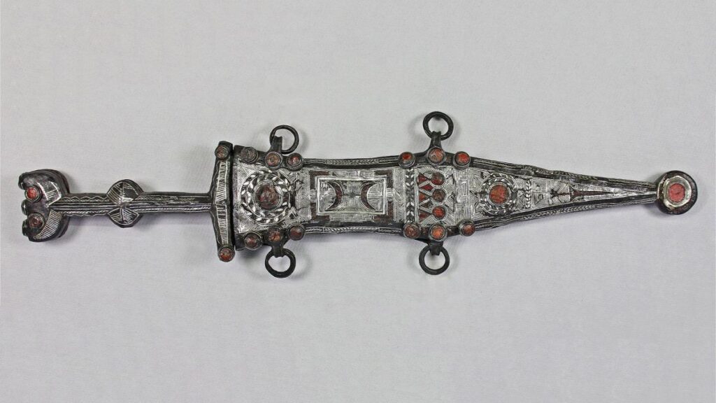 Silver and brass adorn the dagger’s handle, while its iron scabbard features inlaid wood, glass, and red enamel.