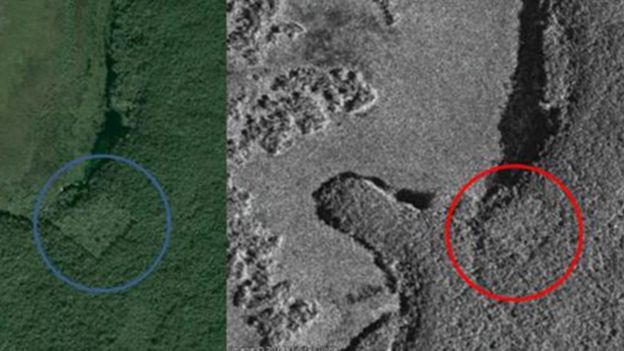 Satellite images compared with Google Earth show potentially man-made structures beneath the jungle canopy.