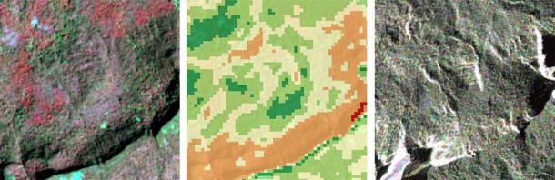 As you can see, the famous Incan site is situated in a “green” zone, which means that the area is suitable. Red corresponds to highly unsuitable regions. The initial area of our research was approximately 1300 km 2 (502 square miles). After mapping settlement suitability, we reduced the research area dramatically. Focusing on highly suitable zones, the team studied high-resolution imagery in different spectral ranges: visible, near-infrared, and microwave. This revealed patterns and structures that were interpreted as potential archaeological sites. Some of them are indicated below. These three pictures cover the same area but highlight different aspects: multi-spectral optical image, settlement suitability map, and a radar image.