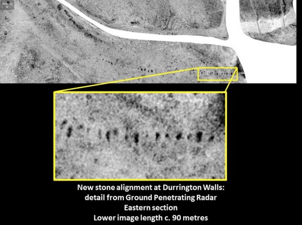 The latest surveys now provide evidence that Stonehenge’s largest neighbour, Durrington Walls, had an earlier phase which included a large row of standing stones probably of local origin and that the context of the preservation of these stones is exceptional and the configuration unique to British archaeology.
