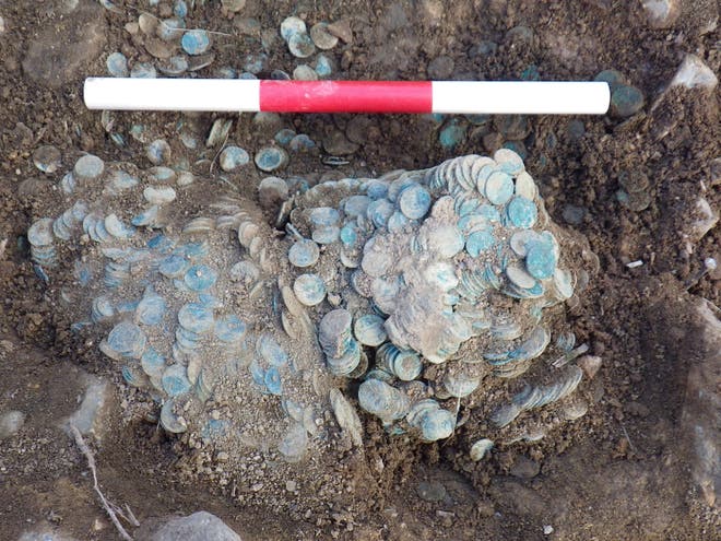 After digging deeper, his shovel came up full of the copper-alloy coins. “They just spilled out all over the field,” he said. “It was an exciting moment. I had found one or two Roman coins before but never so many together.”