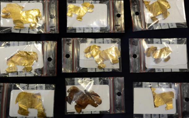 Perforated gold leaves still attached to fragments of leather may have been used to make ear tassels and another regalia to dress young llamas killed in the ancient ceremonies, the researchers believe.