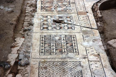 Excavation has focused on a third-century imperial temple, and also a street lined with shops. In July, the team began to explore the mosaic, which was part of a Roman bath. The decoration consists of large squares, each filled with different colored geometric designs and ornamentation.