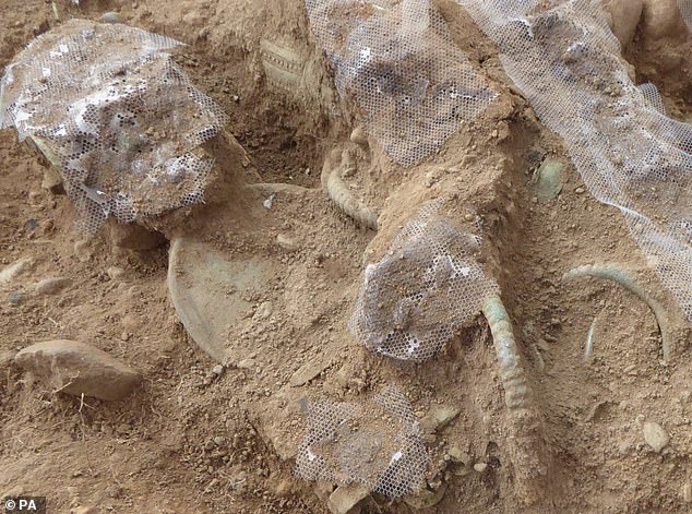The hoard has been moved from the site in a large block of soil and taken to the National Museums Collection Centre in Edinburgh. Experts, who described the objects as ‘nationally significant’, have dated them to the Bronze Age, which began around 2,000 BC and lasted for nearly 1,500 years.
