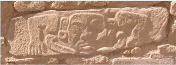 Block carved with humanoid deity. Southern retaining wall, upper citadel, Shimao, Shenmu county, Shaanxi province, China.