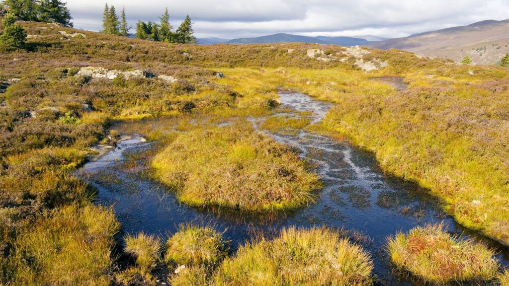Peat moss around a pool in Cairngorms National Park in the United Kingdom