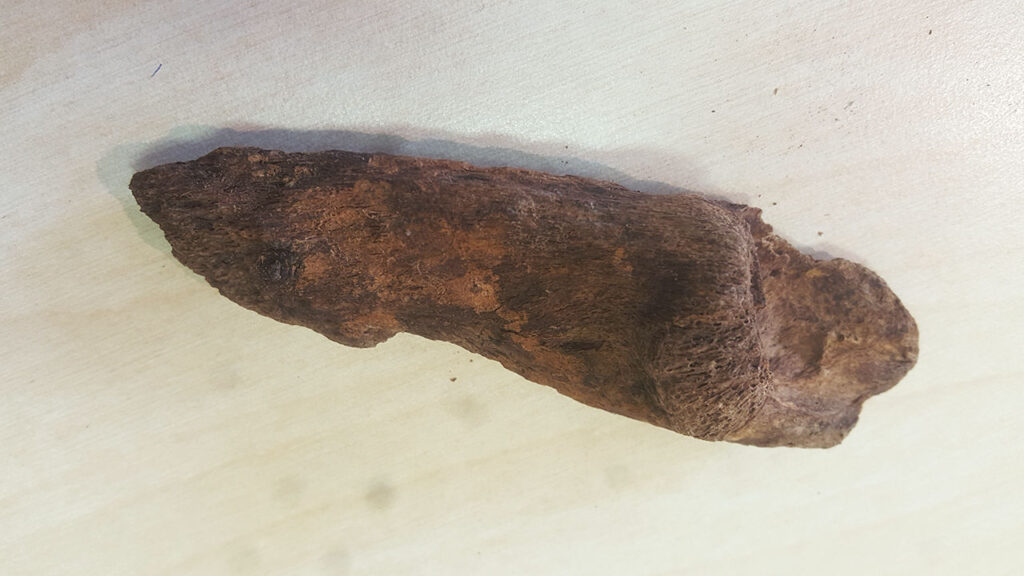 A weathered wild boar heel bone from the 2019 Ageröd excavation