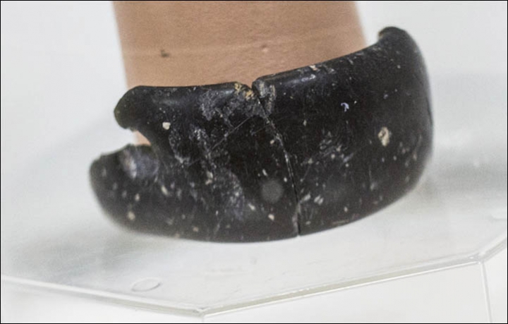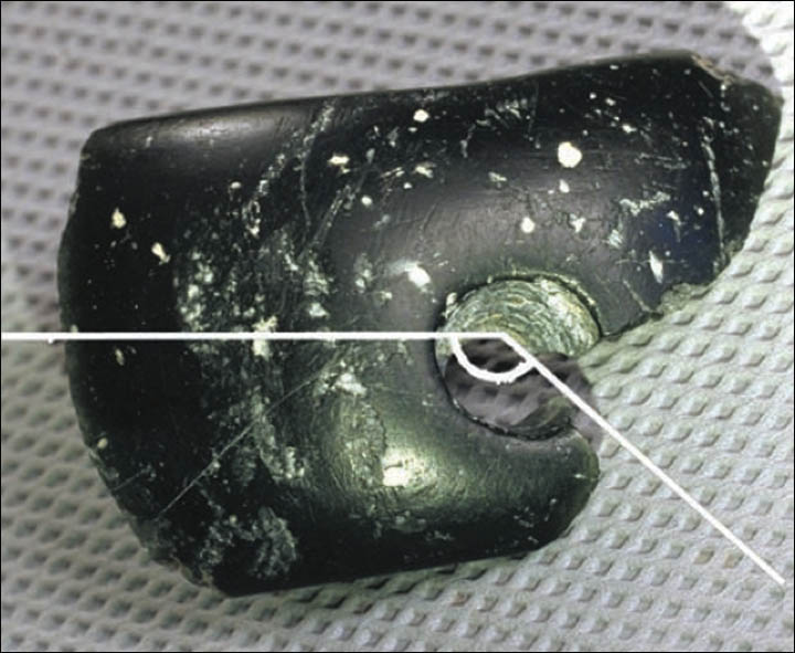 The manufacturing technology used in the bracelet is seen as being more typical of a later period, for example, the Neolithic era, which began around 12,000 years ago. This image shows a hole that was drilled in the bracelet with a high-rotation drill