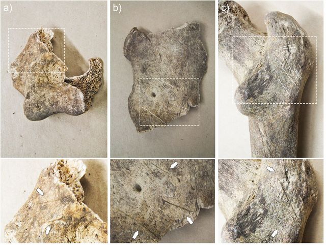 Cut marks on some of the human remains which were discovered at Carrowkeel Cut marks, marked in white (above) and magnified (below), observed on a left humerus (upper arm) from Cairn K (a), the ilium of a left coxae (part of the pelvis) from Cairn K (b), and a right femur (upper leg) from Cairn K (c)