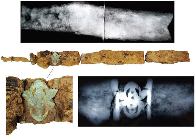 X-rays and initial conservation of the sword and scabbard reveal beautiful copper-alloy decoration at the scabbard mouth, which would have been highly visible when the sword was worn in life.