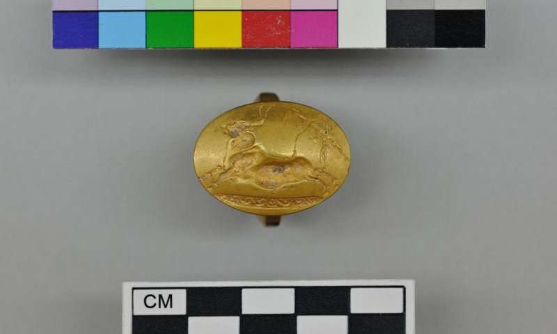 Among the objects found within the warrior tomb were four complete solid-gold seal rings to be worn on a human finger, two squashed gold cups and a silver cup with gold trim, and a unique necklace of square box-shaped golden wires, more than 30 inches long with two gold pendants decorated with ivy leaves.