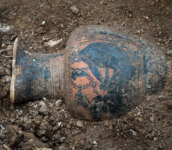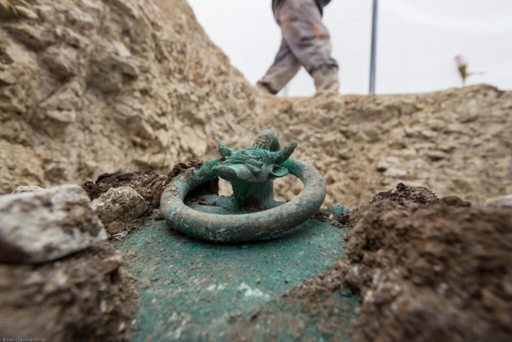 The archaeologists ended up discovering beautiful artifacts from the 5th century BCE, starting with a bronze cauldron ornamented with the head of the god Dionysus.