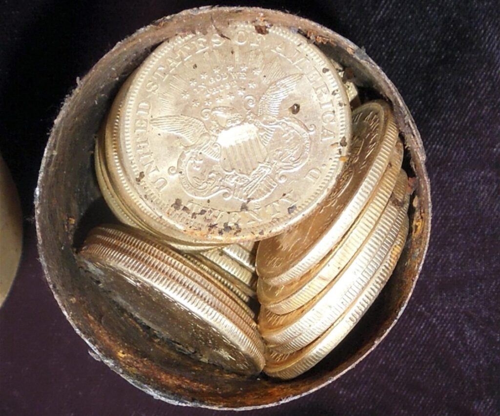 Jack Trout told the paper that an 1866 Liberty $20 gold piece without the words “In God We Trust” was part of the buried stash, and the coin may fetch over $1 million at auction because it’s so rare.
